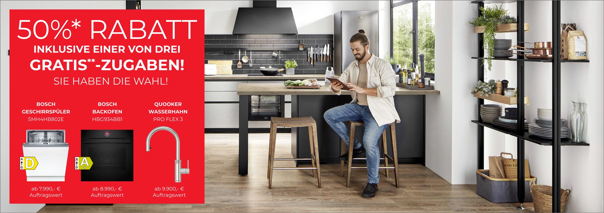 ** Gratis Bosch Einbau-Backofen HBG934BB1 Energieeffizienzklasse A+ (A+++ bis D). Nur gültig auf frei geplante Küchen ab einem Auftragswert von 8.990,- Euro.