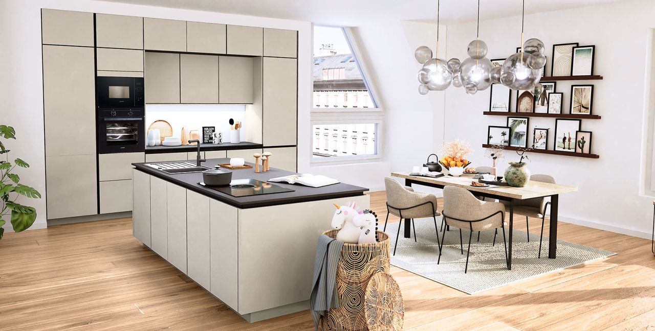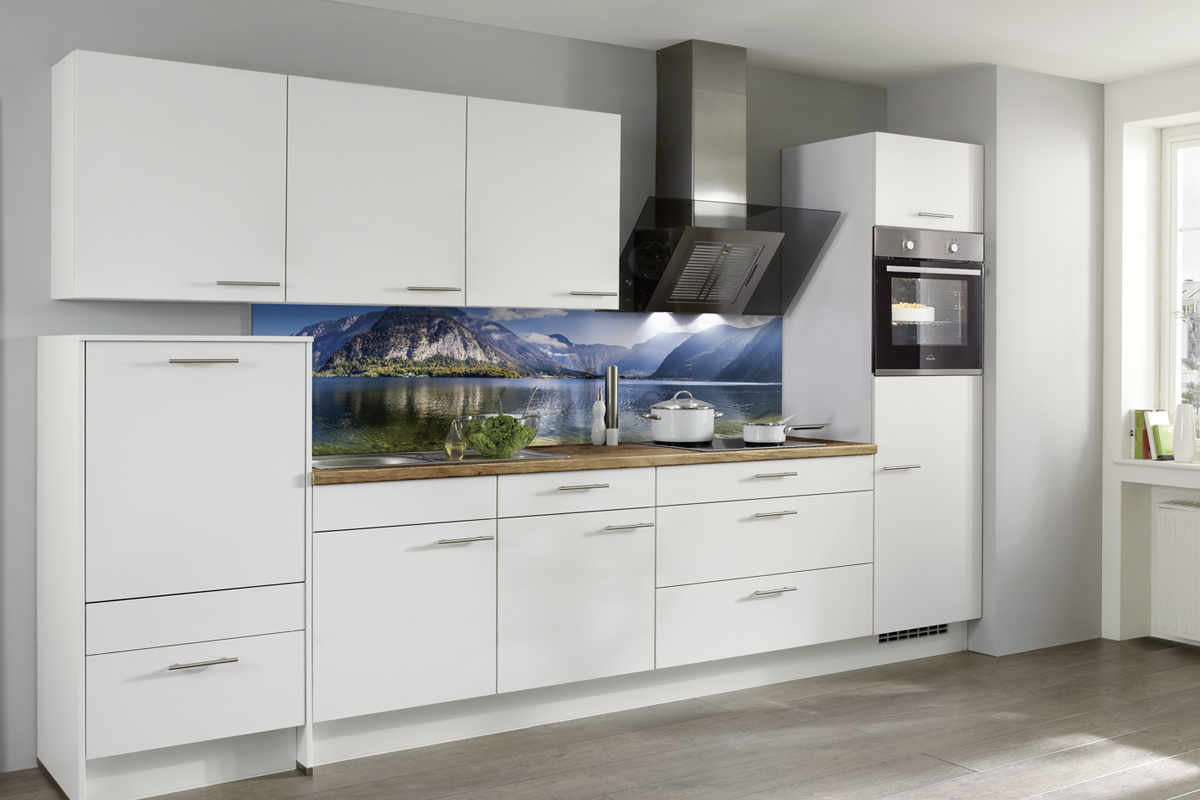 Inklusive Einbaubackofen schwarz Siemens HB234ABB3 Energieeffizienzklasse A+, Glaskeramik Kochfeld mit Induktion und Kochfeldabzug (Umluft) Bora GP4U, Kühlschrank Laurus LKG88E Energieeffizienzklasse E, Mikrowelle Junker JP4119260, Einbau-Designspüle Elleci Logik 300, XL-Schränken, Unterschrank mit Großraumauszügen, Wandschränken mit Klappe.