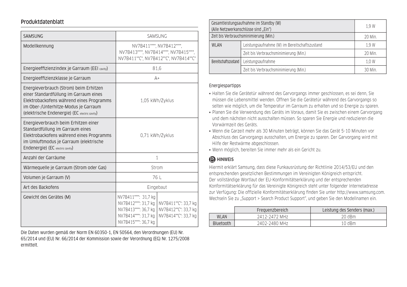 Energieeffizienzklassen und Spektren: Backöfen, Herde und Dunstabzüge A+++ - D. Geschirrspüler und Kühl-/Gefrierschränke A - G und Leuchtmittel A++ - E.