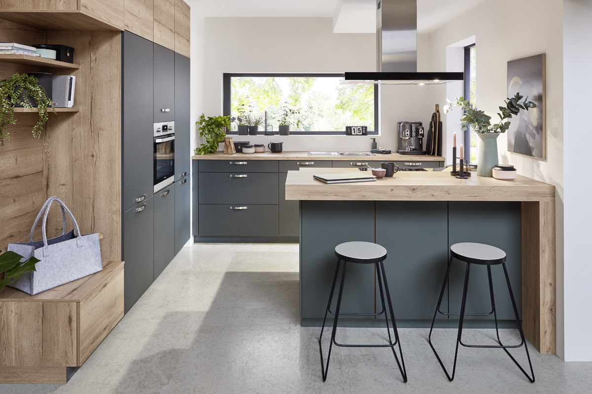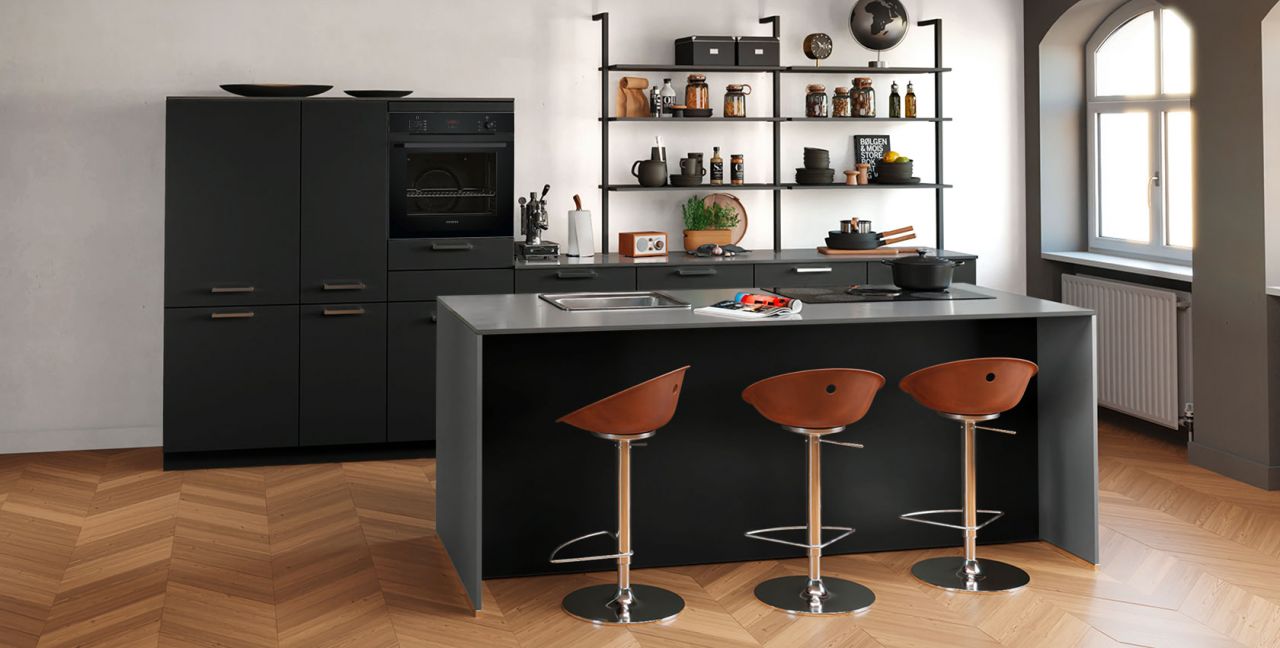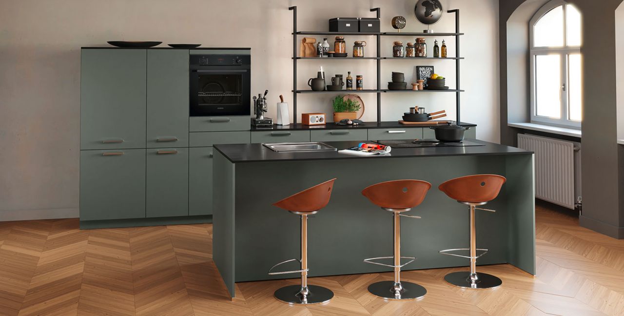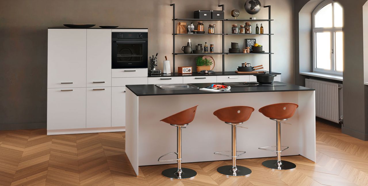 Inklusive Einbaubackofen schwarz Siemens HB234ABB3 Energieeffizienzklasse A+, Glaskeramik Kochfeld mit Induktion und Kochfeldabzug (Umluft) Bora GP4U, Kühlschrank Laurus LKG88E Energieeffizienzklasse E, Einbauspüle Edelstahl Rodi NewManaus, Geschirrschrank, Stollenregalsystem, Esstheke, XL-Schränken.